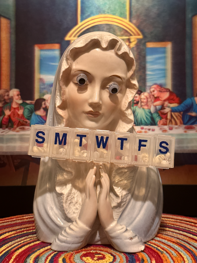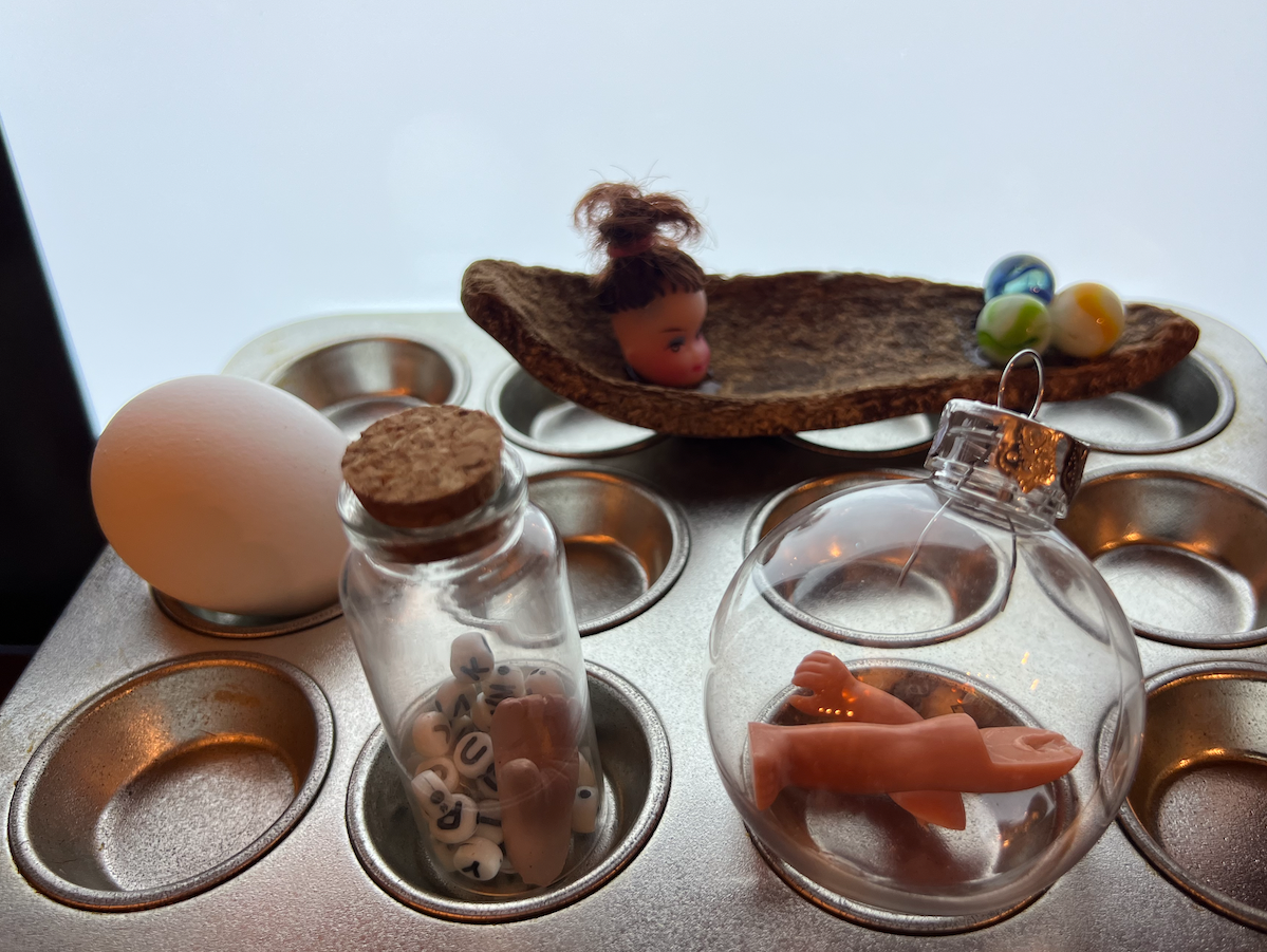 Here we have a small corked glass bottle with a ceramic hand swimming in letter beads, an Xmas ornament with a few plastic limbs (I’ll be adding something colorful to that) and whatever that other thing is.